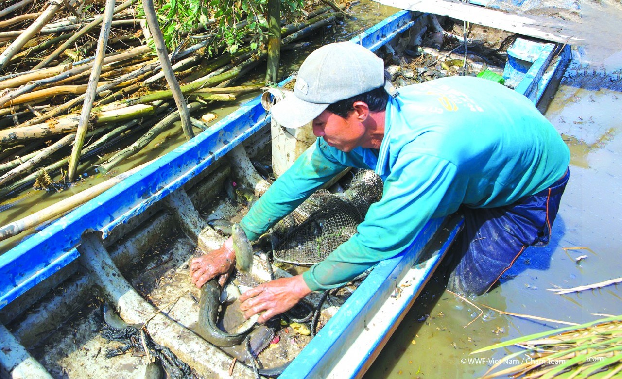 Anh Nguyễn Thanh Nguyên đang thu hoạch cá nuôi kết hợp trong 100 ha trồng lúa nổi. (Ảnh: WWF)