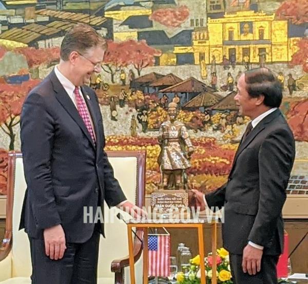Đồng chí Lê Văn Thành, Bí thư Thành ủy, Chủ tịch HĐND thành phố trao đổi với ngài Daniel J.Kritenbrink - Đại sứ đặc mệnh toàn quyền Hợp chúng quốc Hoa Kỳ tại Việt Nam về món quà lưu niệm