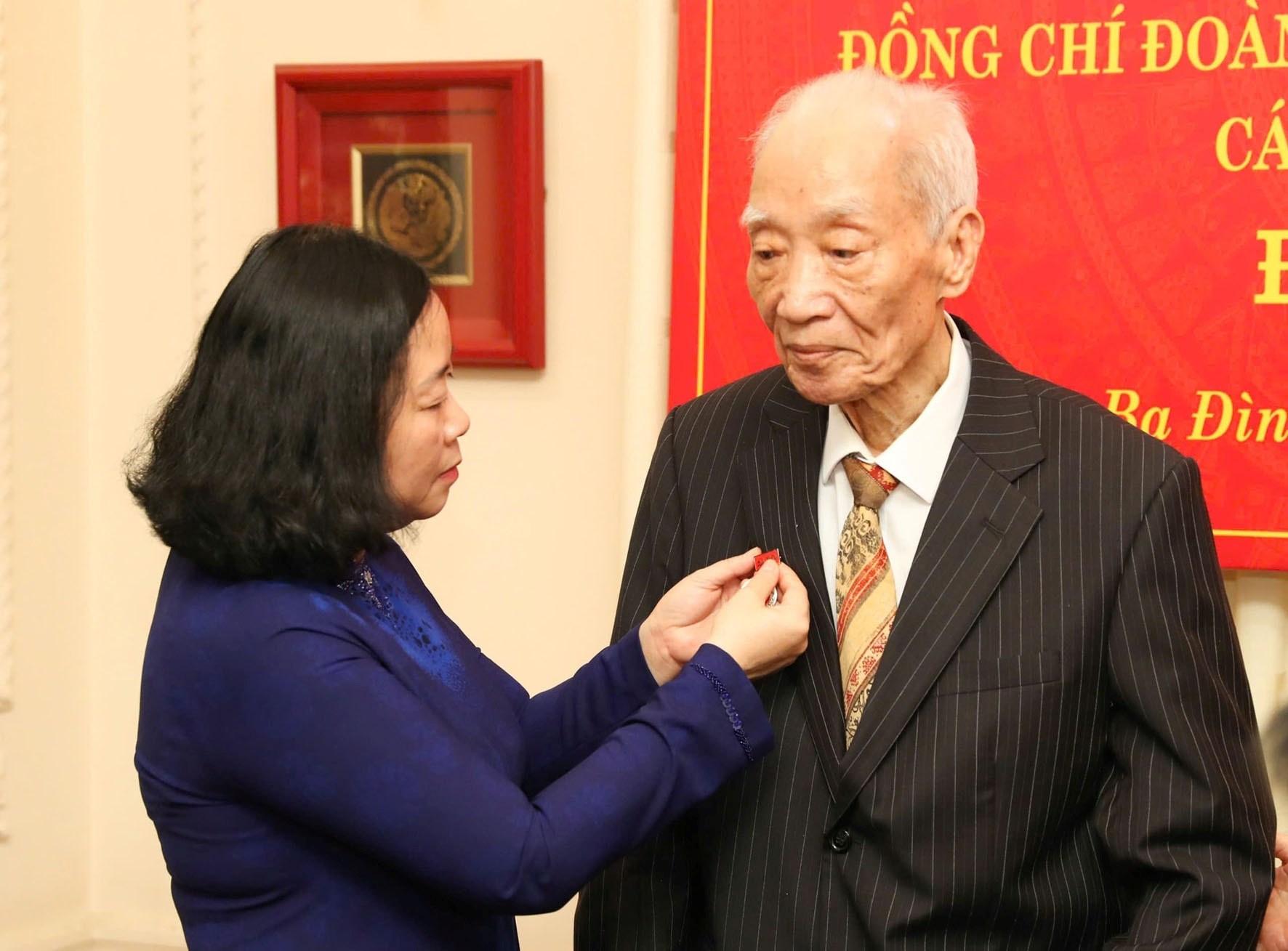 Bí thư Thành ủy Hà Nội Bùi Thị Minh Hoài trao Huy hiệu 80 năm tuổi Đảng tặng đồng chí Đoàn Duy Thành tháng 11/2024. Ảnh tư liệu.