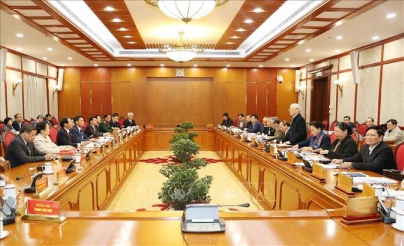 Đồng chí Tổng bí thư Nguyễn Phú Trọng chủ trì cuộc làm việc của Bộ Chính trị với Ban Thường vụ Thành ủy Hải Phòng về tổng kết 15 năm thực hiện NQ 32 và ban hành nghị quyết mới để phát triển Hải Phòng tháng 12- 2018 (ảnh: TTXVN)
