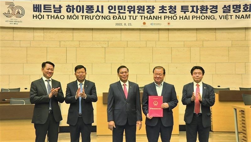 Đồng chí Nguyễn Văn Tùng, Chủ tịch UBND thành phố trao giấy chứng nhận đăng ký đầu tư cho các nhà đầu tư Hàn Quốc