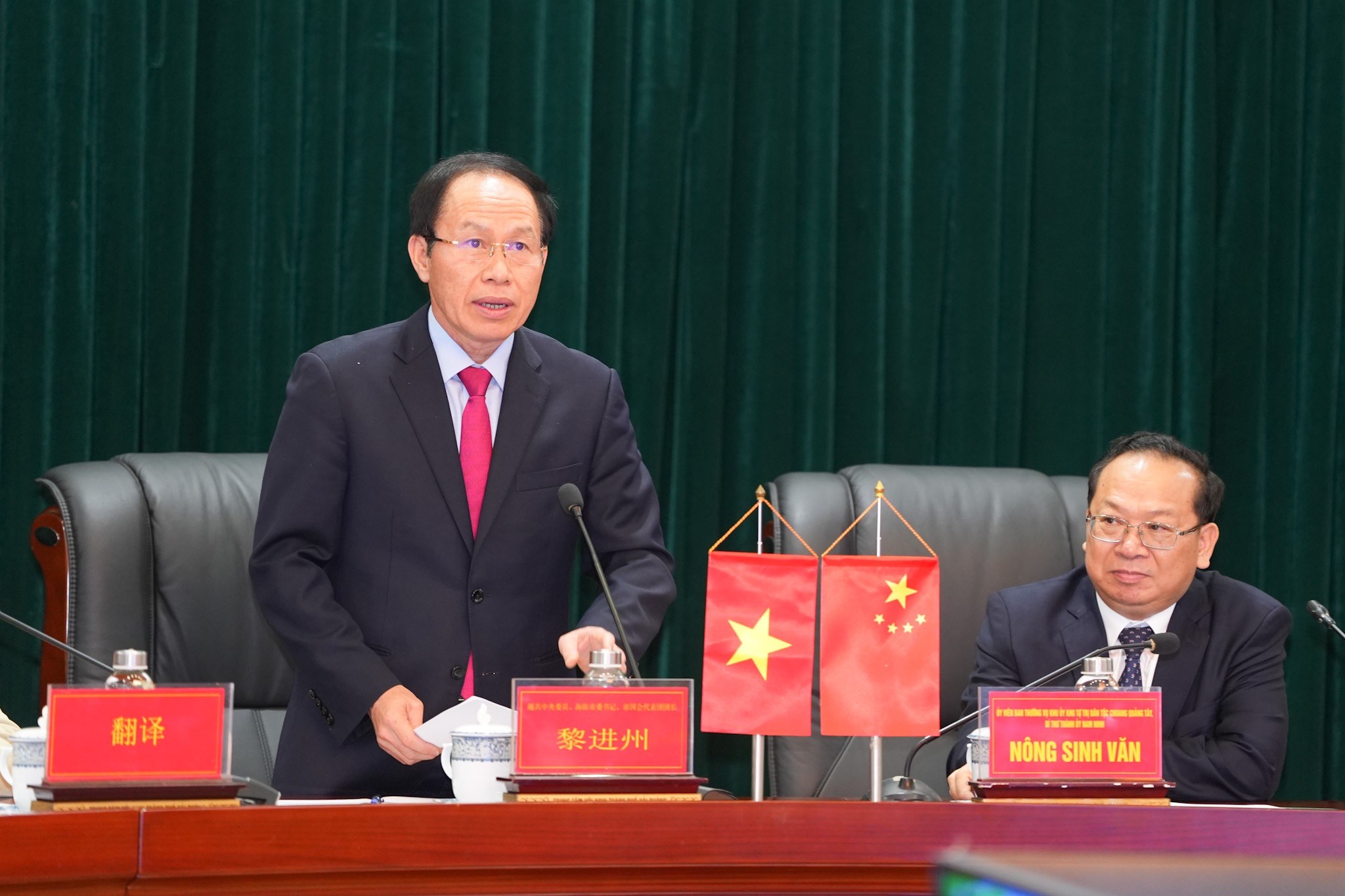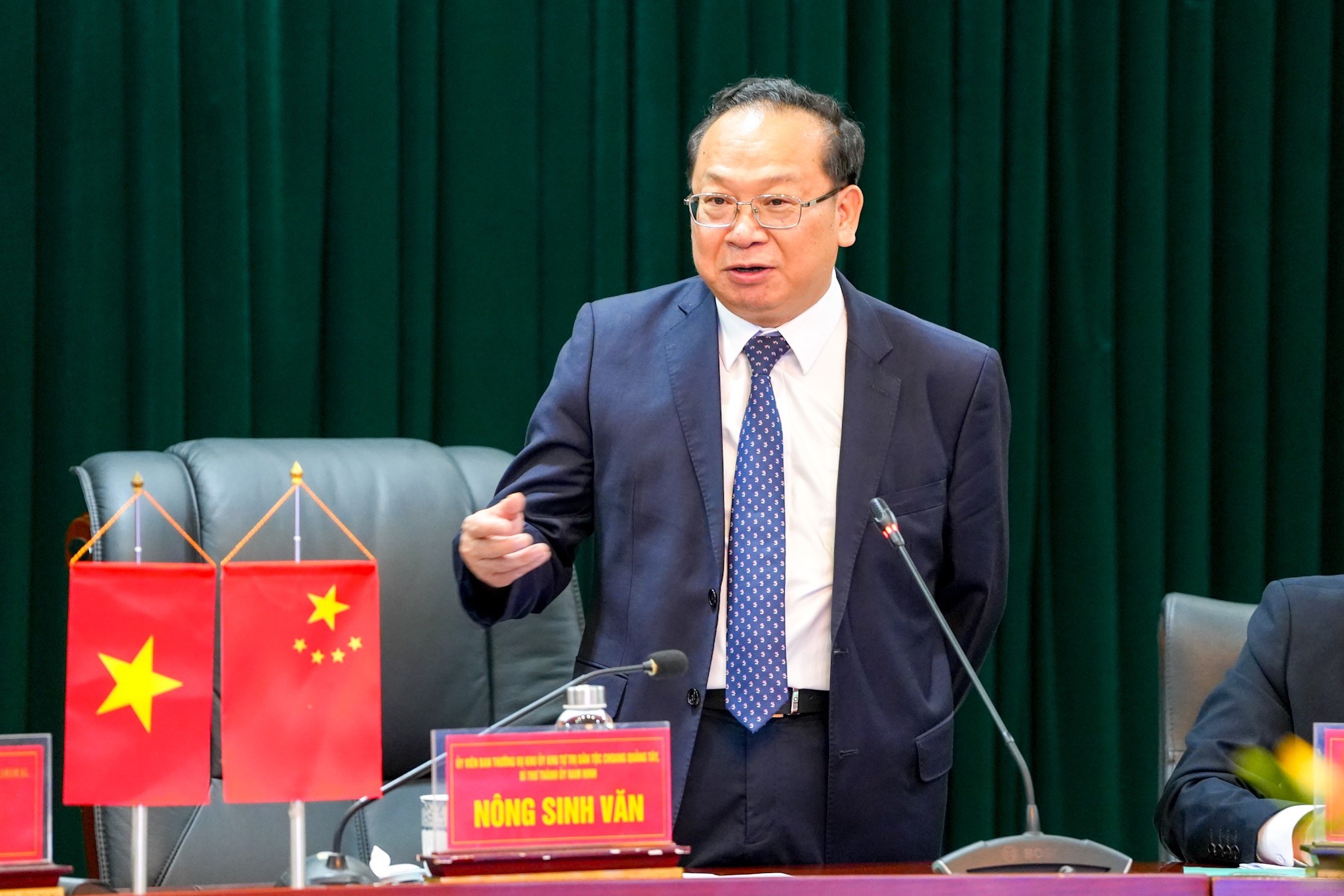 đồng chí Nông Sinh Văn, Ủy viên Ban Thường vụ Đảng ủy Khu tự trị dân tộc Choang Quảng Tây, Bí thư Thành ủy Nam Ninh phát biểu tại cuộc làm việc.