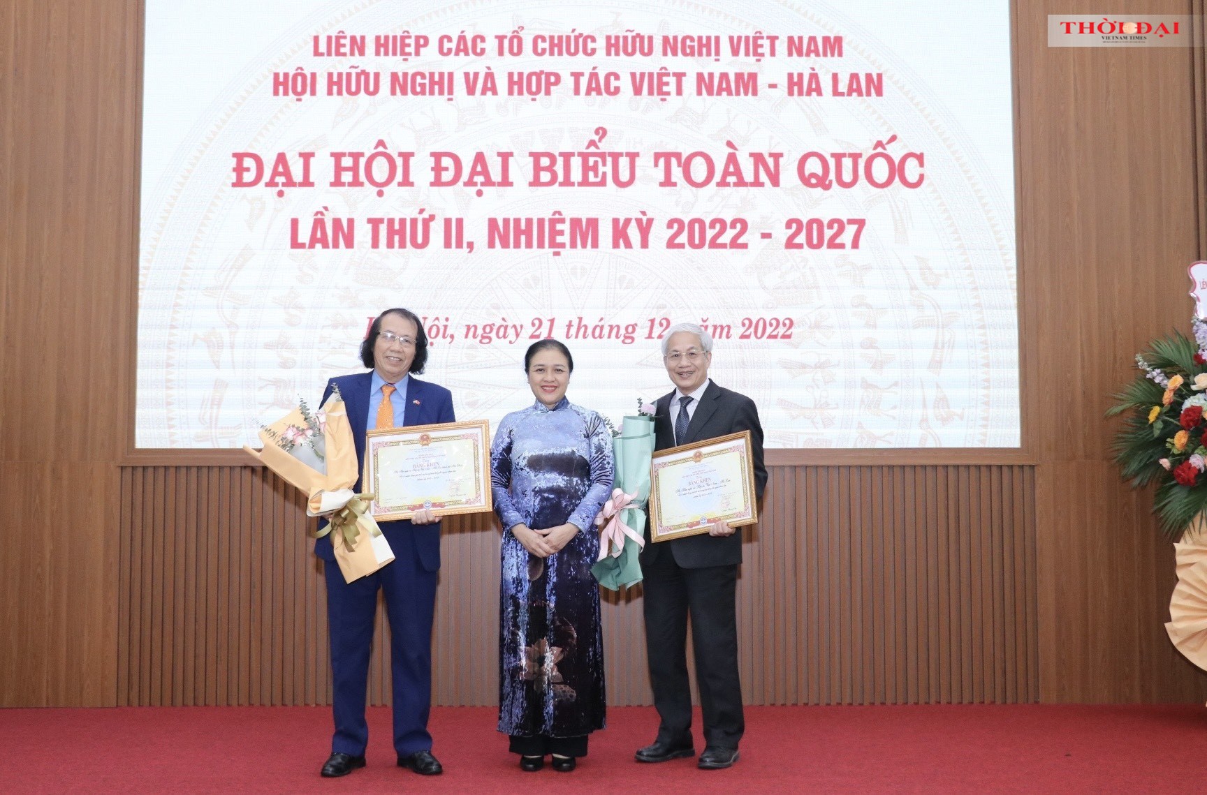Chủ tịch Liên hiệp các tổ chức hữu nghị Việt Nam Nguyễn Phương Nga (ở giữa) trao Bằng khen cho đại diện hai tập thể của Hội hữu nghị và hợp tác Việt Nam - Hà Lan đã có thành tích 2 tập thể và 9 cá nhân của Hội vì đã có nhiều đóng góp tích cực trong hoạt động đối ngoại nhân dân nhiệm kỳ 2013-2019 (Ảnh: Thu Hà).