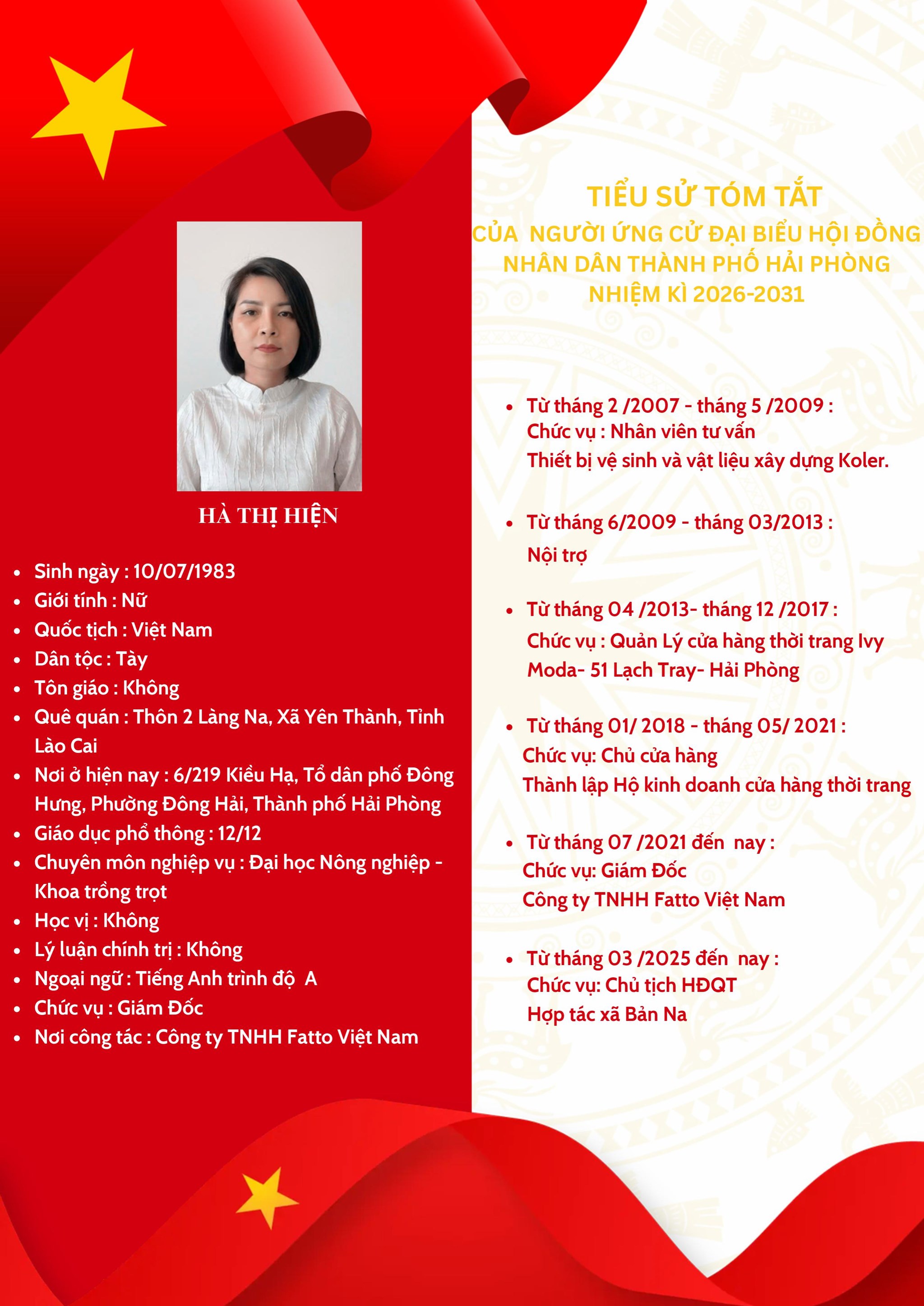 Đồng chí Hà Thị Hiện, hội viên Hội hữu nghị Việt Nam - Hàn Quốc thành phố, ứng cử Đại biểu Hội đồng nhân dân thành phố Hải Phòng nhiệm kỳ 2026-2031 tại tổ bầu cử số 13