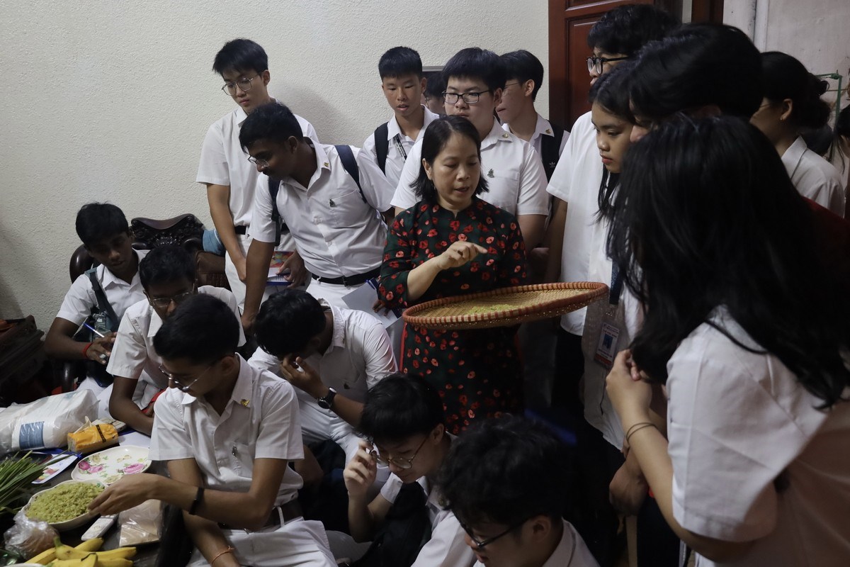 Cô giáo Lê Huyền, Phụ trách chương trình trao đổi du học sinh trường Raffles Institution và Trường THCS và THPT Nguyễn Tất Thành dẫn đoàn học sinh thăm và tìm hiểu Cốm Làng Vòng.