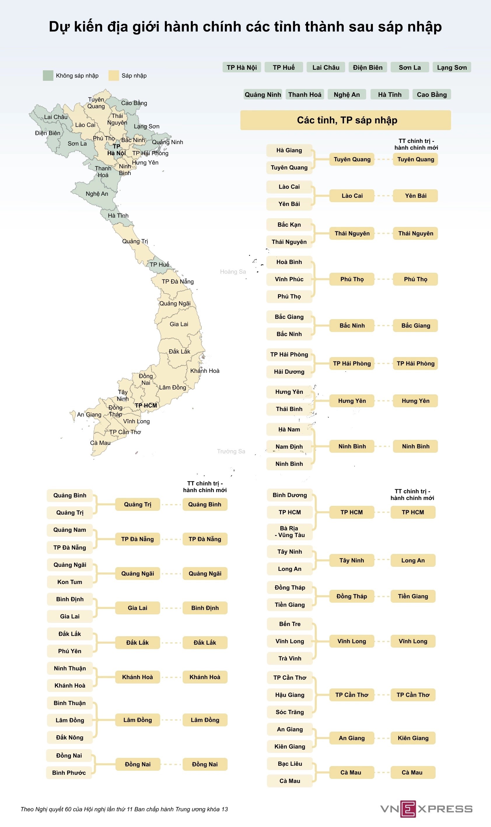 Theo Nghị quyết 60, Việt Nam sẽ còn 28 tỉnh, 6 thành phố trực thuộc Trung ương sau khi 52 địa phương sáp nhập thành 23 và 11 tỉnh, thành giữ nguyên trạng.