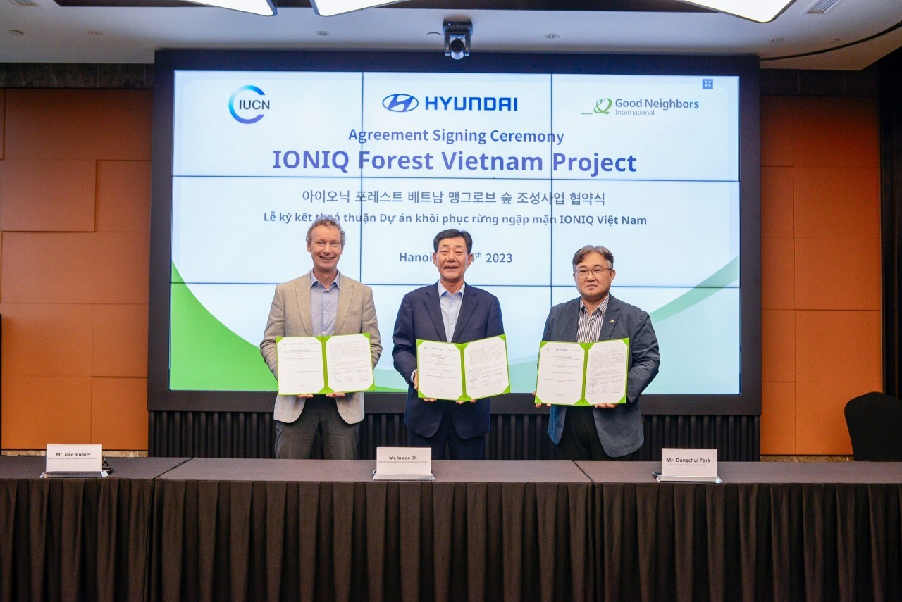 Ông Park Dong Chul, Trưởng đại diện GNI, ông Oh Inwon, Đại diện HMC, ông Jake Brunner, Đại diện IUCN Việt Nam ký thoả thuận hợp tác triển khai dự án khôi phục rừng ngập mặn IONIQ Việt Nam.
