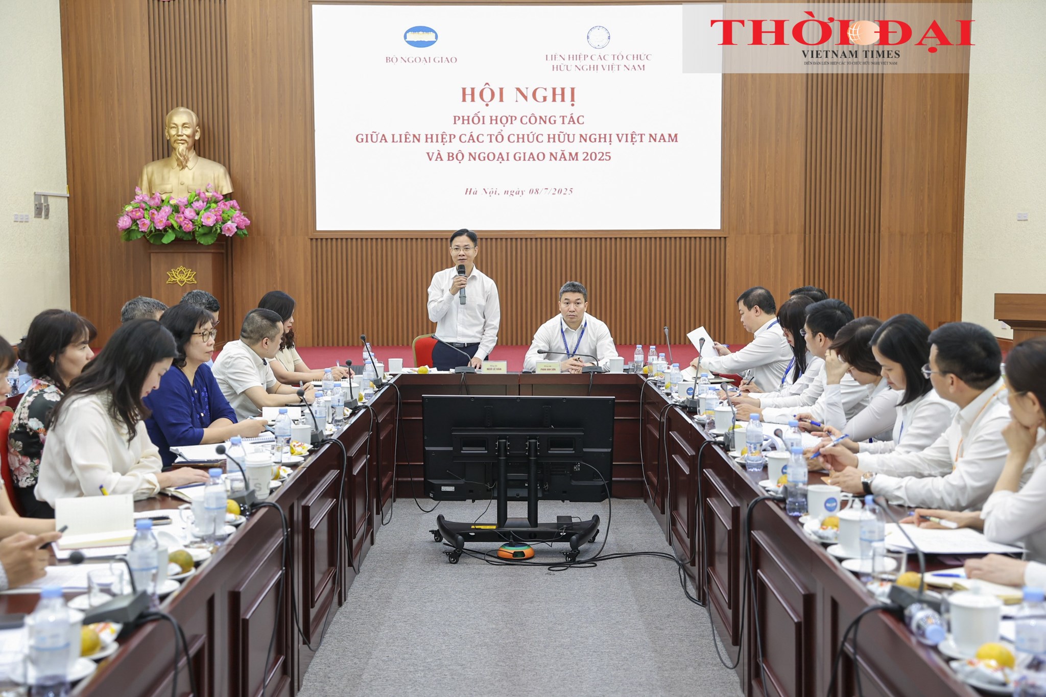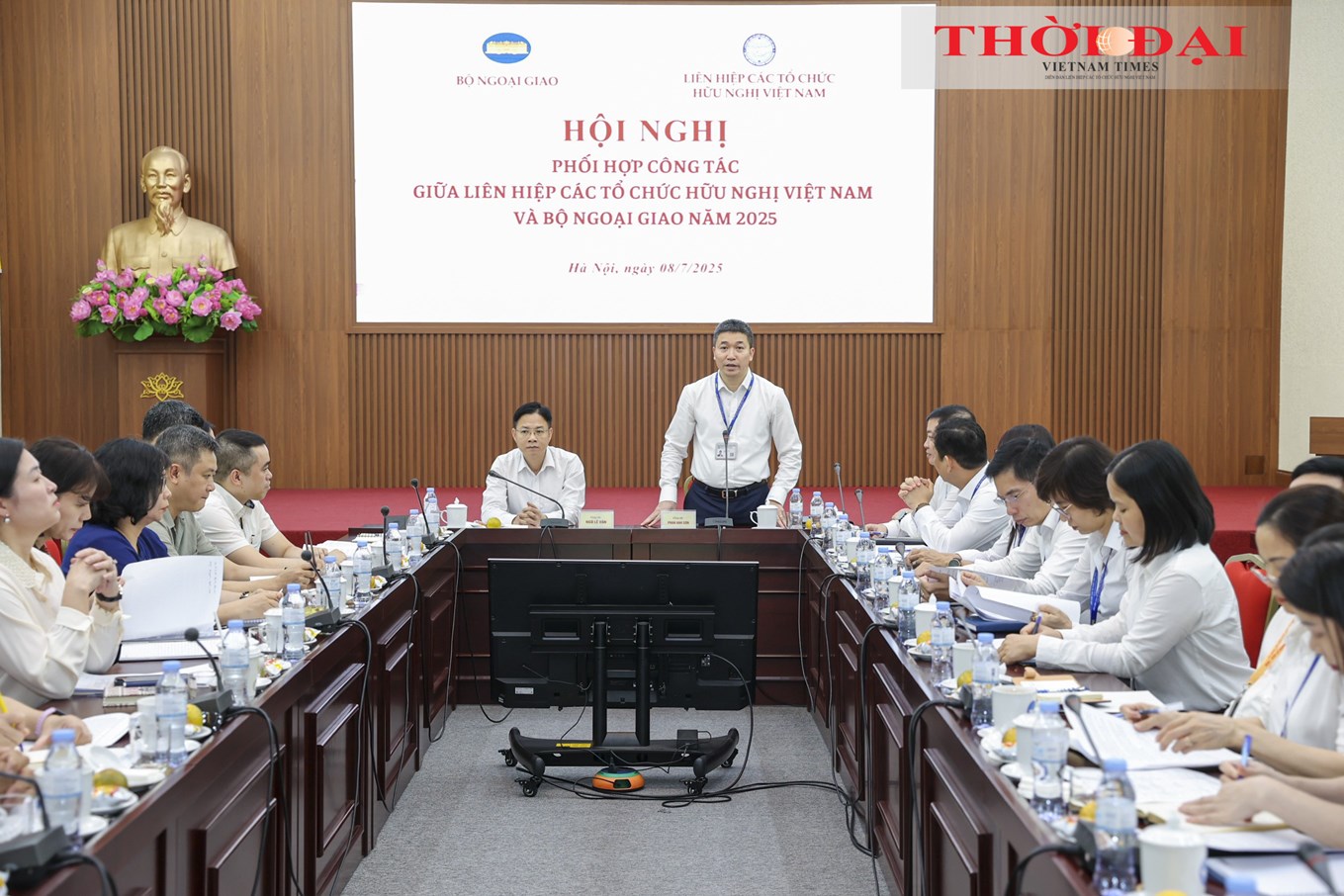 Ngày 08/7 tại Hà Nội, Liên hiệp các tổ chức hữu nghị Việt Nam và Bộ Ngoại giao tổ chức Hội nghị phối hợp công tác năm 2025. Hội nghị do Chủ tịch Liên hiệp các tổ chức hữu nghị Việt Nam Phan Anh Sơn và Thứ trưởng Bộ Ngoại giao Ngô Lê Văn đồng chủ trì.